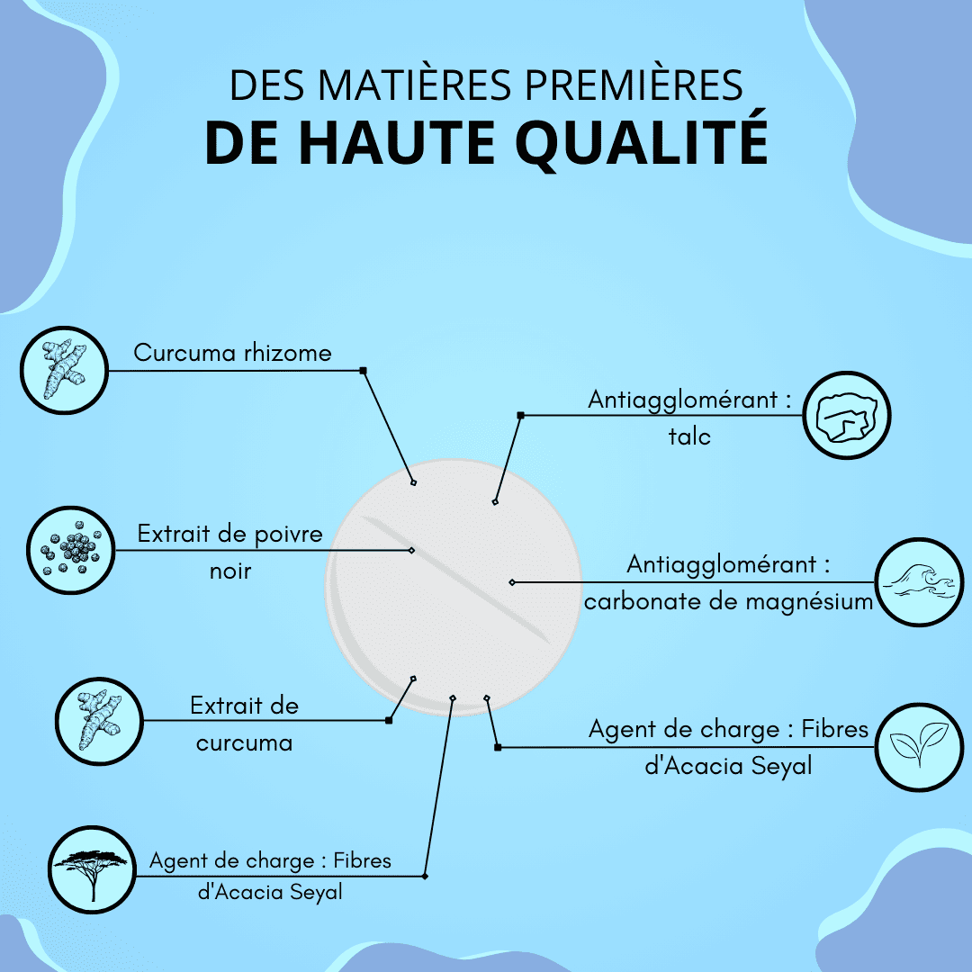 Curcuma rhizome* (Curcuma longa), extrait de curcuma* titré à 95 % en curcuminoïdes et 70 % en curcumine, fibres d’Acacia seyal* (agent de charge), maltodextrine*, antiagglomérants : carbonate de magnésium, talc, extrait de poivre noir* (Piper nigrum) titré à 95 % en pipérine.