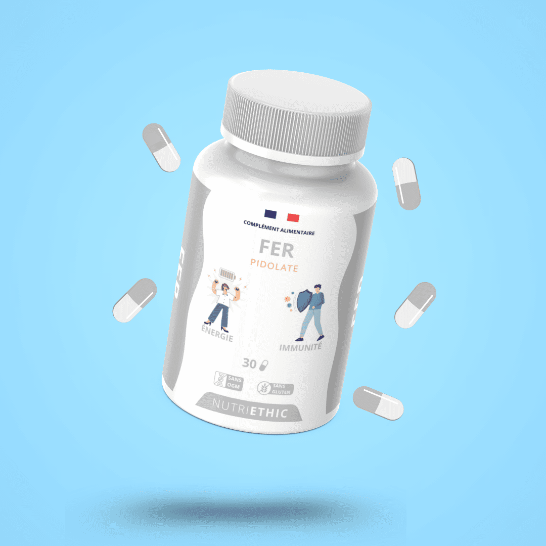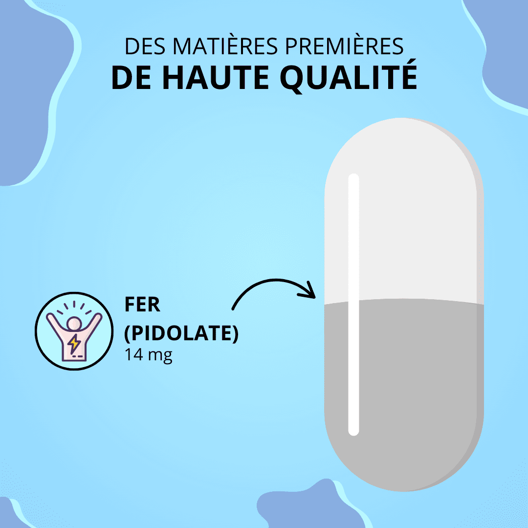 Nous utilisons du fer sous forme de pidolate, une forme organique réputée pour sa haute biodisponibilité et son excellente tolérance digestive.
