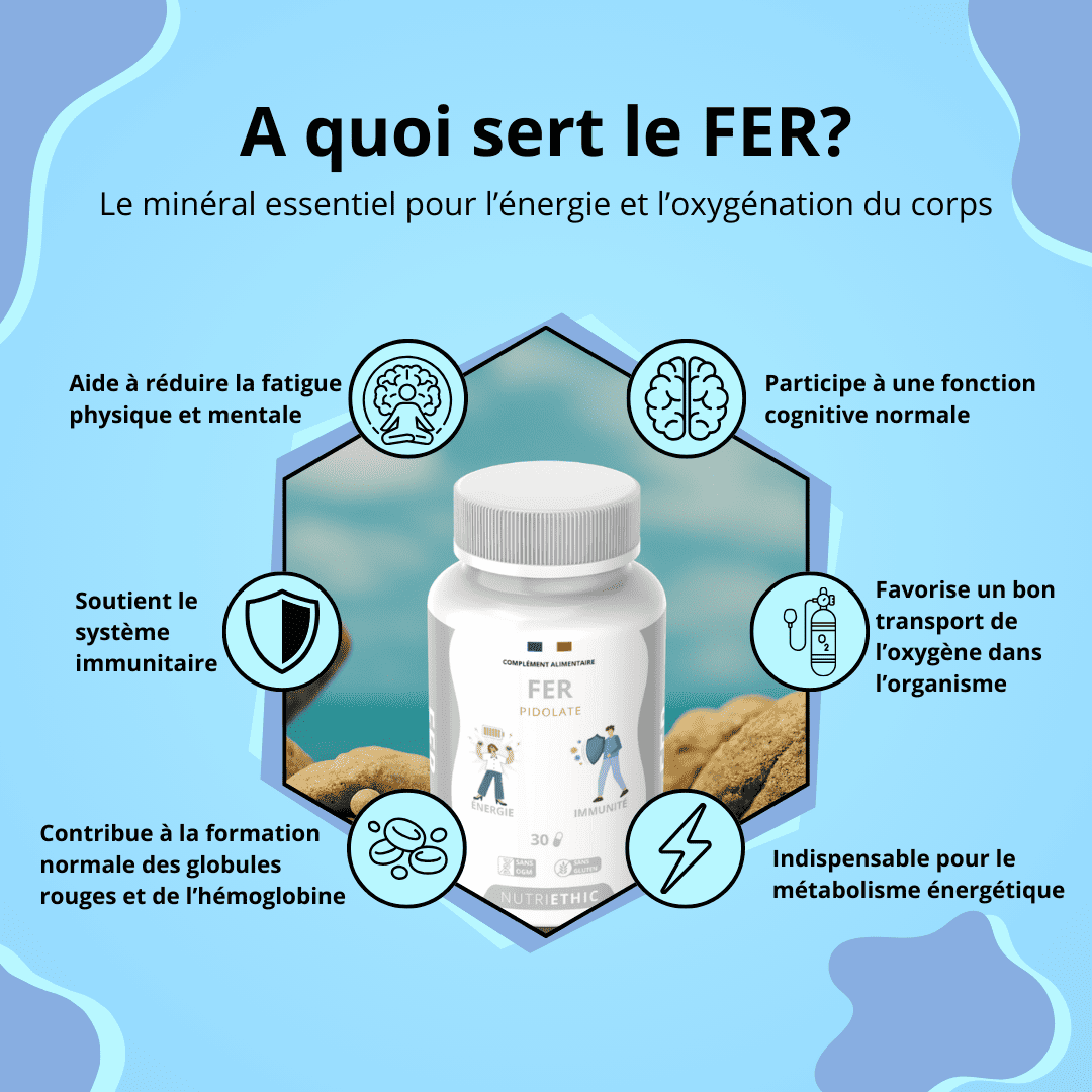 Le fer est un nutriment essentiel au bon fonctionnement de l’organisme. Il intervient principalement dans la formation des globules rouges, le transport de l’oxygène dans le sang (via l’hémoglobine), et le soutien du métabolisme énergétique.