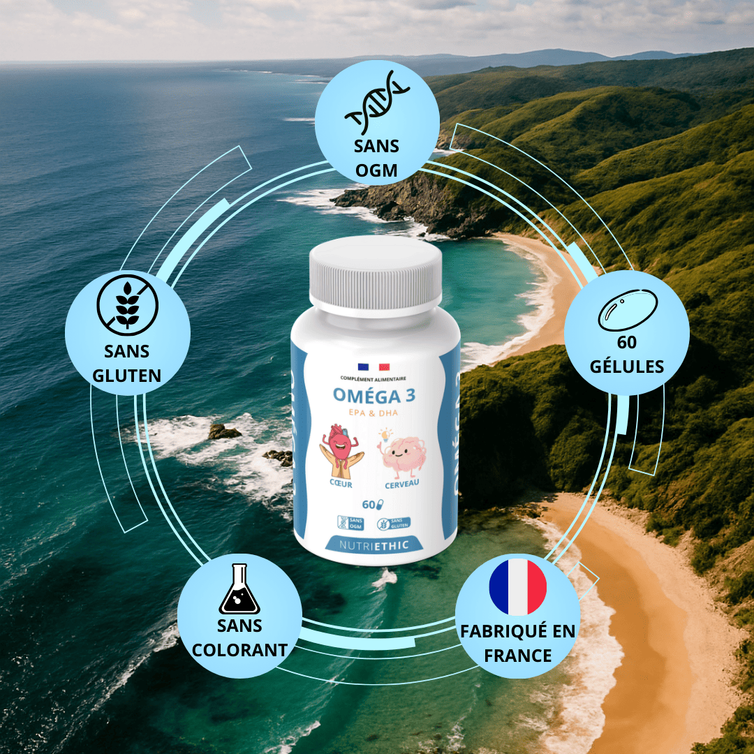 Le complément Oméga-3 de NutriEthic se distingue par sa forte concentration en oméga-3 : chaque capsule contient 65 % d’acides gras EPA/DHA, soit 325 mg par gélule.